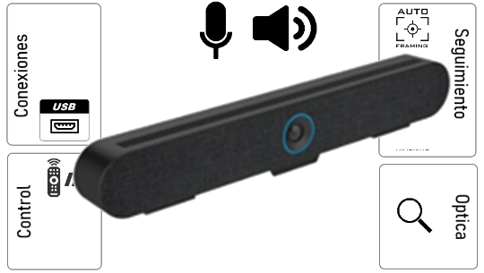 Solución todo en uno para espacios de 5 a 10 personas que incluye altavoz y micrófonos con cámara que enmarca automáticamente a las personas en la mesa así estas varíen.